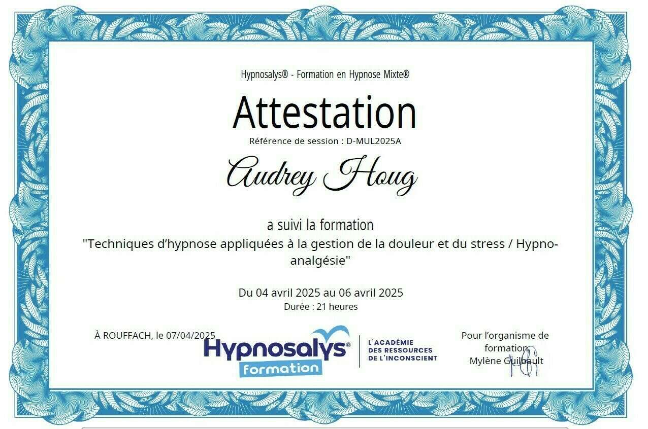 J'ai suivi la formation "techniques d'hypnose appliquées à la relation d'aide" chez Hypnosalys